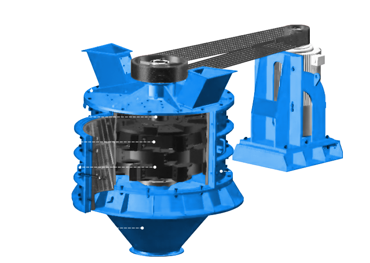 PFL系列復(fù)合式制砂機(jī)較大進(jìn)料粒度240mm,成品出料粒度<3mm,破碎比大;一次成品率高達(dá)70%-90%。