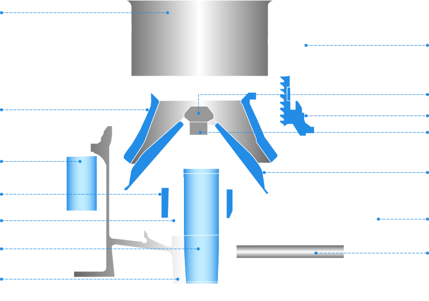 液壓馬達驅(qū)動調(diào)整套(定錐襯板),可對排料口進行準確調(diào)整,使給料穩(wěn)定,襯板利用率高、產(chǎn)品粒型好。液壓馬達還可使調(diào)整套和定錐襯板全部轉(zhuǎn)出支撐套,以便更換定錐襯板和動錐襯板,從而大大簡化了襯板更換的工作量。