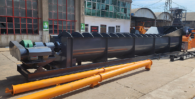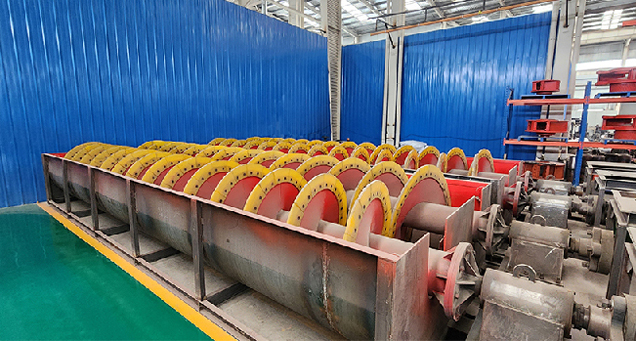 螺旋洗砂機由槽體、減速機、電機、中心軸、螺旋葉片、支架組成。機器轉(zhuǎn)子采用中心結(jié)構(gòu),螺旋葉片安裝在中心軸上,有減速機連接到中心軸上進行工作。借助固體顆粒的比重不同,因而在液體中沉降得速度不同的原理,進行機械分機的一種設備。